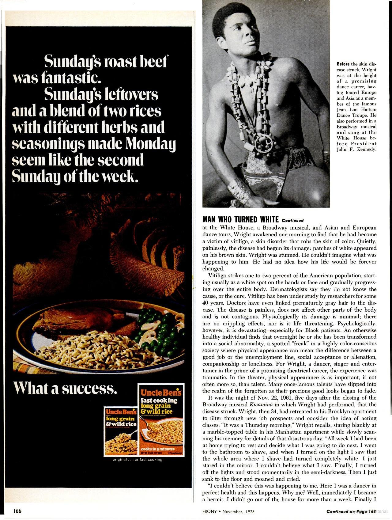 What followed that memorable day was eight years of suffering, Wright says –eight years of being laughed at, talked about and singled out in crowds. They were years of applying facial makeup daily. Eventually, when the disease spread to the chest, thighs, arms and legs, makeup had to be applied to Wright’s entire body before he appeared on stage. Meanwhile he consulted eight dermatologists in New York, Chicago and Washington, and even in Europe. Each offered a different cure. None worked. There were numerous pills, lotions, creams and balms which purportedly would restore Wright’s skin to its once rich brown color. None worked. There was deep depression and a short barbiturate addiction, the results of a cure prescribed by one dermatologist.  There was the loss of friends, the loss of lovers, and there was fear – fear that the makeup mask he so diligently applied each morning would be discovered, his condition revealed, and the rejection that usually followed the unmasking repeated. […]